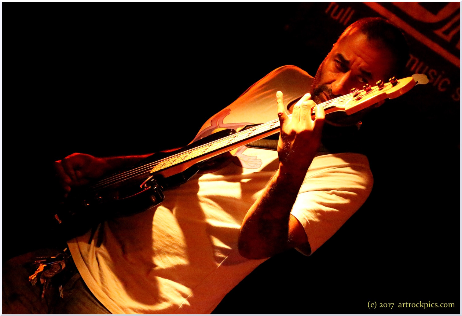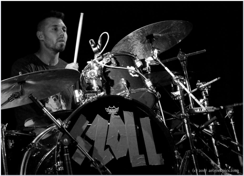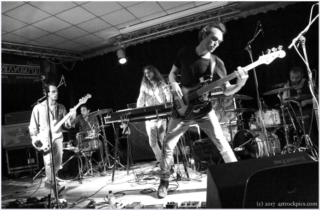 Das Quartett hat mit "Thin Ice" einen flammenneuen Langspieler mit dabei, der offiziell allerdings erst 2018 erscheinen wird. Aus diesem geben sie das Titelstück, 'Rift' und 'Fooled' zu Gehör. Die Wirkung ihres Auftritts lässt sich vielleicht am besten so vermitteln: Im Gegensatz zu sonstigen Konzerten oder gar Festivals gab es bei der Freakshow keinen klassischen Merch-Stand. Am ersten Tag gab's in der Hinsicht genau gar nichts. Am zweiten hatte der mit Musikalien handelnde Charly auf besagtem Balkon phantastisch bestückte, aber komplett unbewachte "Wühlkisten" aufgestellt. Das heißt: wer sich für etwas interessierte, musste erst Charly ausfindig machen, um den Preis zu erfahren und zu entrichten. Klappte aber großartig (Lutz: "Charly beklaut keiner"). Auch Merch der Bands wurde in der üblichen Form sonst kaum angeboten. DRH aber hatten immerhin was sie an CDs, T-Shirts und Postern dabei hatten, mit Preisen versehen links vor der Bühne hübsch drapiert aufgebaut. Erstes Lied. Nichts passiert. Zweites Lied. Mehrere Hörer erheben sich von ihren Plätzen, grooven links vor die Bühne, sichern sich die begehrten Trophäen und werfen den Preis dafür in ein dafür vorgesehenes offenes Behältnis. Der Strom der Käufer nahm mit jedem Song und jedem Solo von Gitarrist/Komponist Danilo Rodriguez, von Rémi Matrat (Saxophon/Komponist) und Josselin Hazard (Schlagzeug und gespielt böse Blicke) zu und am Ende sind die Franzosen ihre Bestände gut und verdient losgeworden!