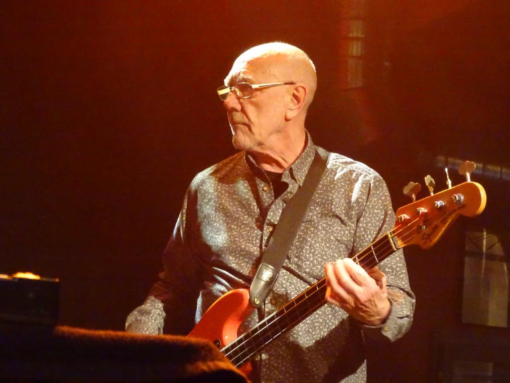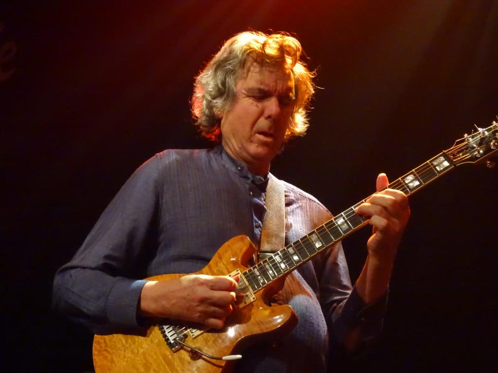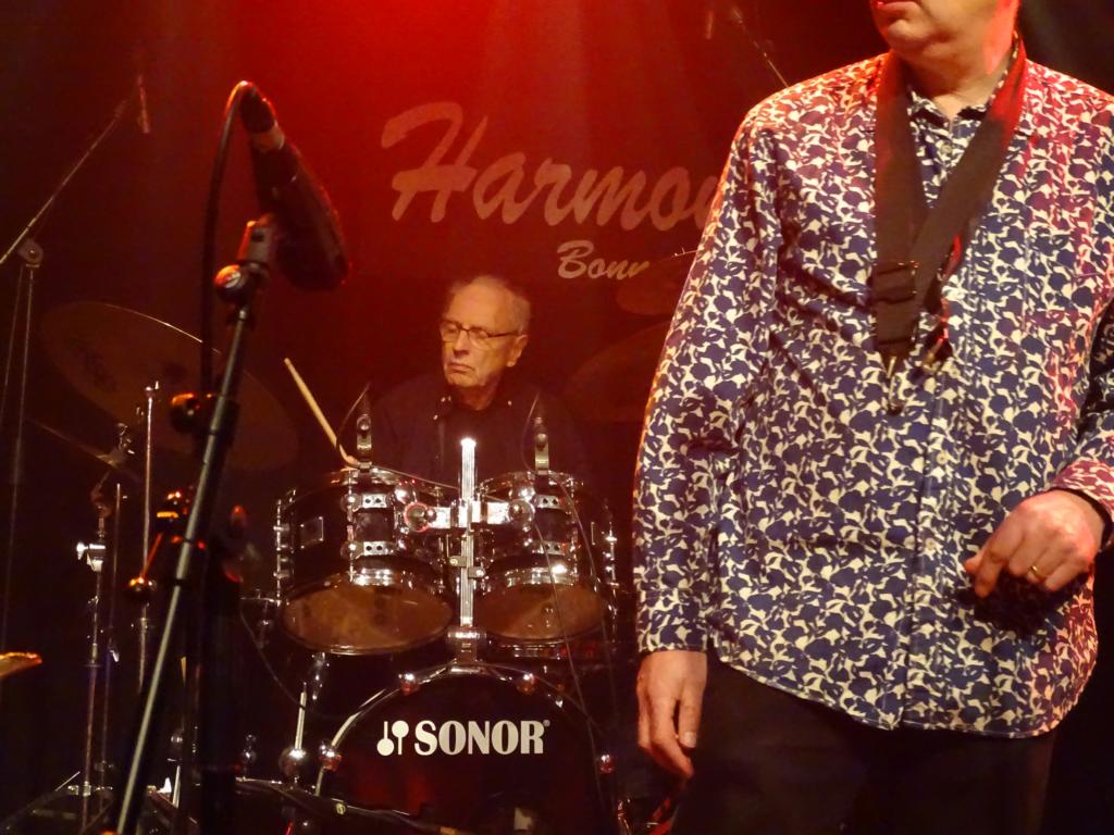 Der Gig in der überraschend gut besuchten Harmonie geriet von der ersten Nummer an energiegeladen. Die vier Herren im gehobenen Alter spielten mit bemerkenswerter Schnelligkeit und Flüssigkeit hals-, pardon, fingerbrecherische Fusion-Passagen der Extraklasse. Die Rhythmus-Sektion Babbington/Marshall groovte nicht wenig und formte einen komplexen, selbstbewussten Hintergrund für die Solo-Ausflüge von Travis und Etheridge. Überhaupt, John Etheridge. Und wer hätte gedacht, dass Progger so viel Selbstironie und Humor haben können? Der Gitarrist führte ausgesprochen launig mit Ansagen und Anekdoten aus der Soft-Machine-Historie durch eine Setlist, die sich zu etwa gleichen Teilen aus Titeln des aktuellen Albums „Hidden Details“ und klassischen Soft-Machine-Gassenhauern (sic!) zusammensetzte, etwa 'Out Bloody Rageous' (aus dem Album „Third“), 'Kings and Queens' („Fourth“), 'The Man Who Waved at Trains' („Bundles“) und 'The Tale of Taliesin' („Softs“). Etheridge, zumindest auf der Bühne der klare Leader der Band (auch wenn er eher schüchtern links saß bzw. stand), erzählte hanebüchene Geschichten über den armen Roy Babbington, der sich ohne Mikro nicht gegen die Behauptungen (14 Kinder von drei verschiedenen Frauen, blonde, glatte Haare, die Mitte der 1970er bis zu den Knie reichten) wehren konnte. Das Publikum goutierte diese humorvollen Ausflüge mit lautem Gelächter. Armer Roy!