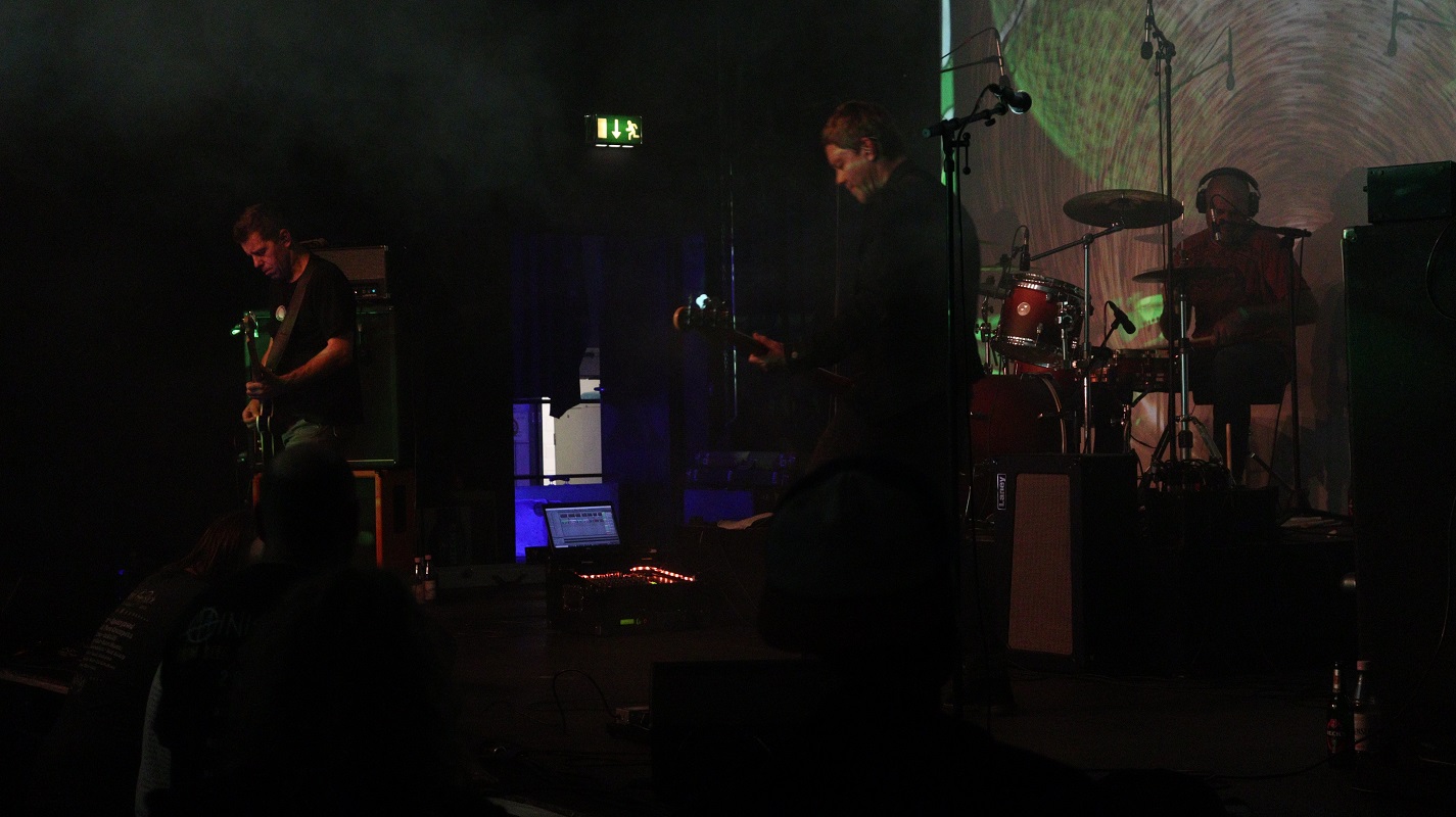 Es war schon spät in der Nacht der Zeitumstellung, als das Trio aus Frankfurt am Main die Bühne betrat. Nach den Spacelords war nun die zweite rein instrumentale Besetzung dran. Außer dieser Eigenschaft sind die Parallelen zwischen den beiden Bands allerdings rar gesät, denn Glasgow Coma Scale spielten sich in farbenfrohen Spiralen aufbauenden Post Rock. In ihrer Kunst versunken und häufig von der Nebelmaschine versteckt, präsentierten die drei Musiker aus Hessen ebenjenen Sound, der als idealer Abschluss für diesen Abend passte.