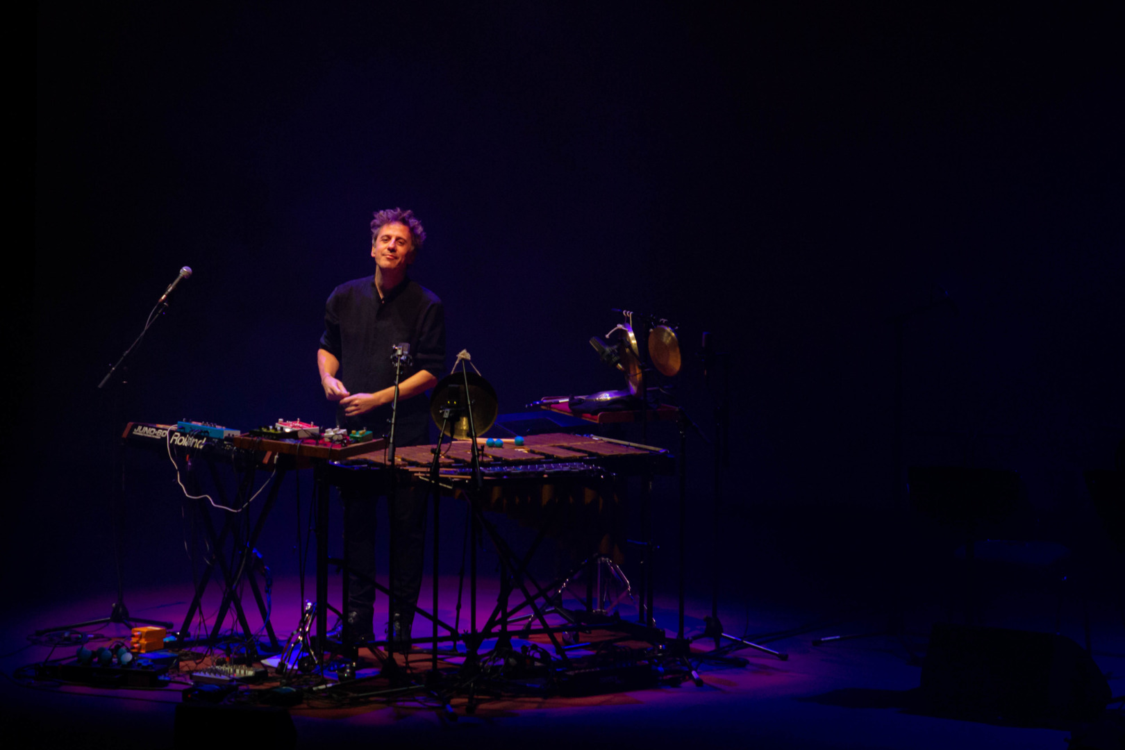 Doch die Bühne betrat Pascal Schumacher zu Beginn seines Konzertes erst einmal alleine. Er nutzte die Gelegenheit, seine Studenten und die übrigen Zuschauer auf Lëtzebuergesch willkommen zu heißen und auf den weiteren Abend einzustimmen. Es folgten mit 'Tropismes' und 'Falling Falling' zur Einstimmung ein zwei sanfte Stücke von "Sol". Vor allem beim zweiten führte er eindrucksvoll vor, wie leicht doch das Spiel mit den vier Stöcken auf den Zuschauer wirken kann. Bevor das Doppelpack aus 'Melancolia' und 'Nostalgia' die Brücke vom 2030er zum aktuellen Album schlug. Das Auditorium lauschte fast andächtig. Jedes auch nur auch so kleine Geräusch versuchte man zu vermeiden, um die Performance nur ja nicht zu stören oder gar zu beeinträchtigen.