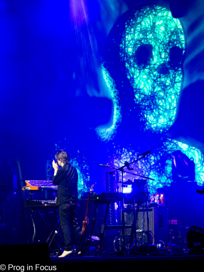 Steven Wilson, gekleidet in ein schwarzes T-Shirt mit einem blauen Kreis darauf, der die Erde symbolisiert, betrat die Bühne wie gewohnt barfuß. Mit der ersten Vorstellung von „The Overview“, die 40 Minuten dauerte, versetzte er die etwa 3.000 bis 4.000 Zuschauer in der Halle in eine ätherische Trance.