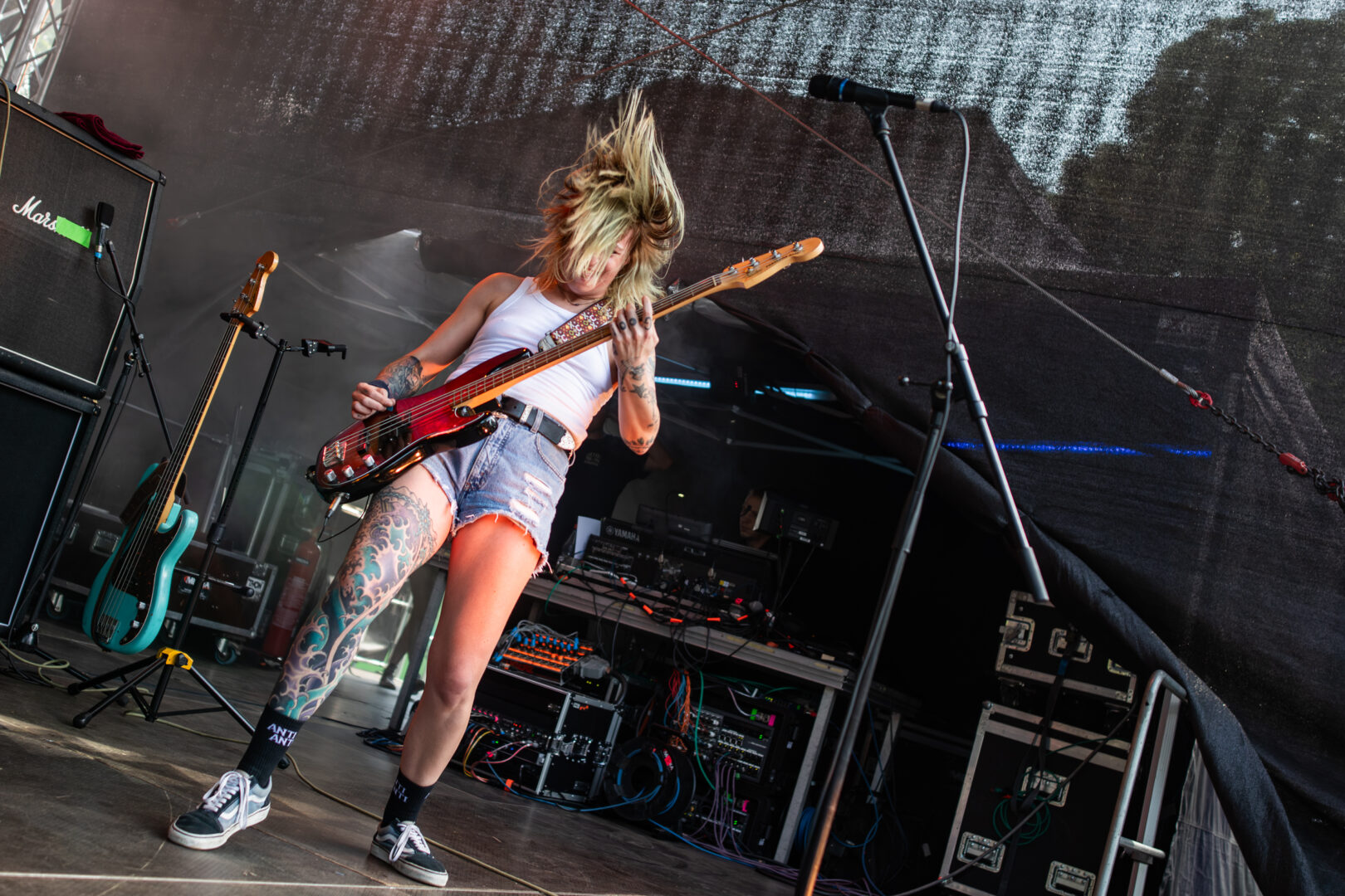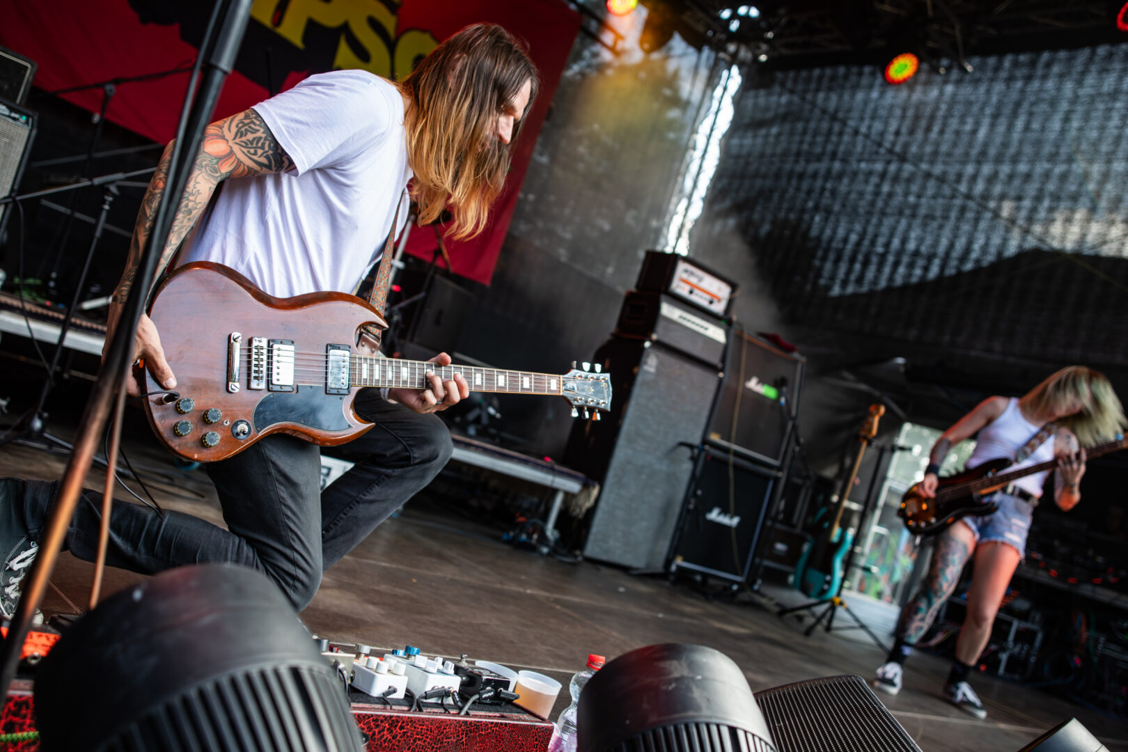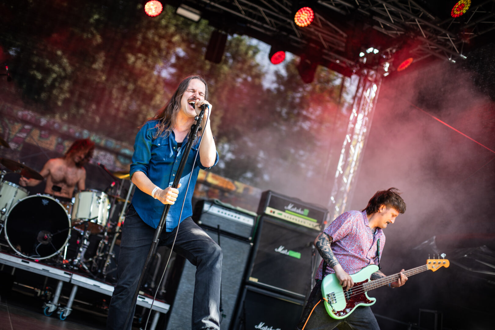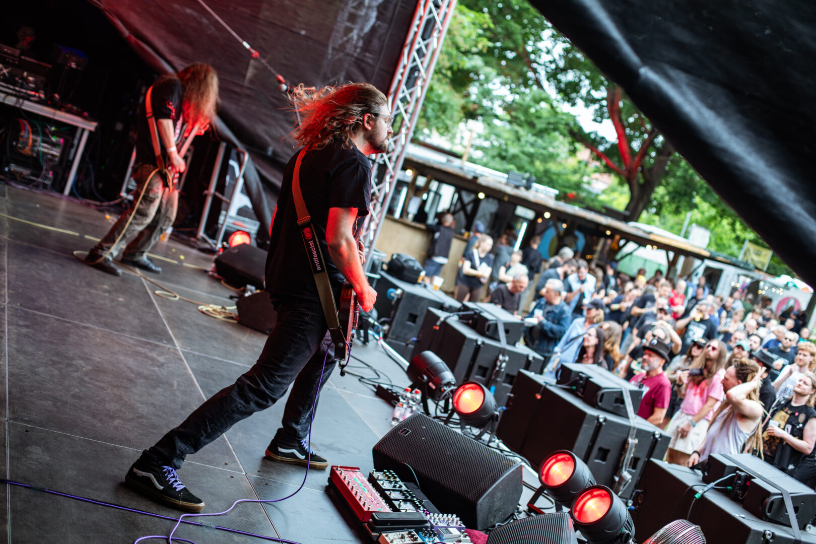 Die Dortmunder sind natürlich längst eine Institution, auf vielen Festivals Stammgäste und die Band hatte Bock. Das Power Trio hatte einen richtig geilen Bühnensound, Bassistin Mercedes grinste im Dauer-Mode und generell hatte die Truppe einfach positive Vibes. Ich musste bei manchen Songs dank des schweren Grunge-Fundaments im Sound an die frühen Smashing Pumpkins denken, auch wenn die Band natürlich breiter aufgestellt agierte. So viel Groove – direkt ins Herz und Brust spielende Power Chords – ein starker Gitarrensound und hier fing meine mentale Liebelei mit dem sich später wiederholenden Gedanken an: „Wow, dies alles nur mit einer Gitarre – sowas von fett und heavy." Auch wenn die Band früh dran war, jeder Song war ein kleiner alternativer Hit, die Soli von Sänger/Gitarrist Danny gingen direkt durch jede Vene und dies alles mit praller Sonne nach einer Woche Dauerregen – Herz, was willst Du mehr?