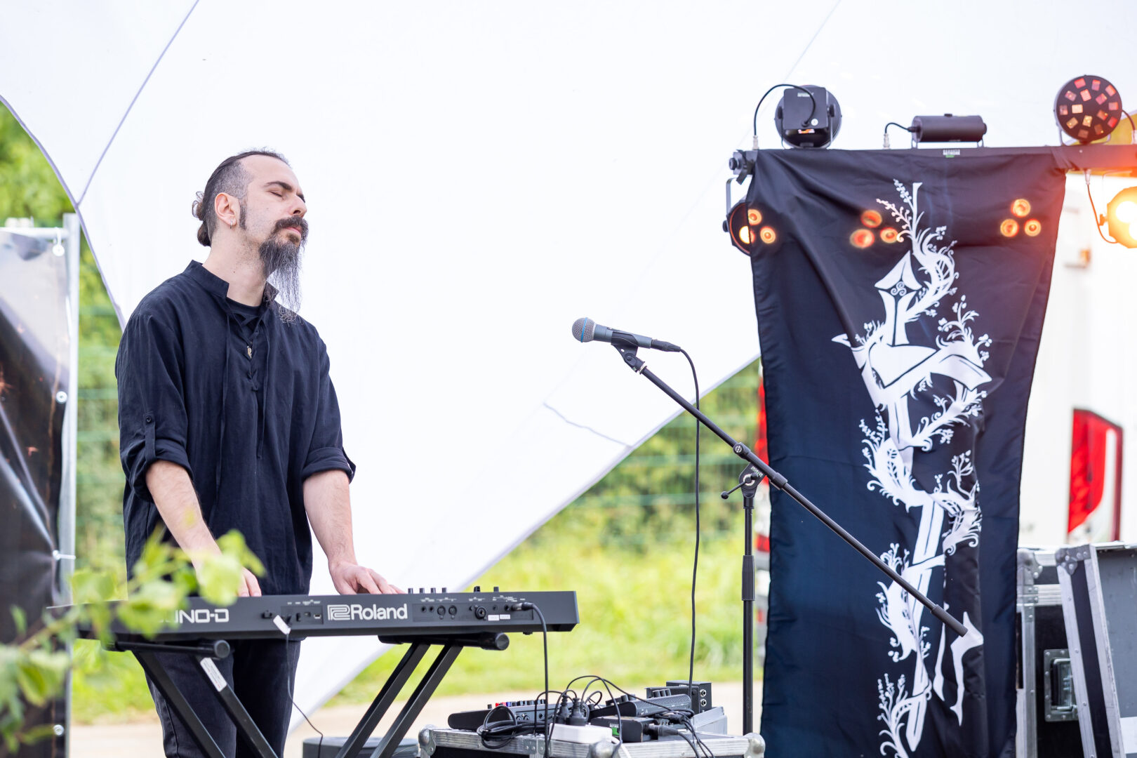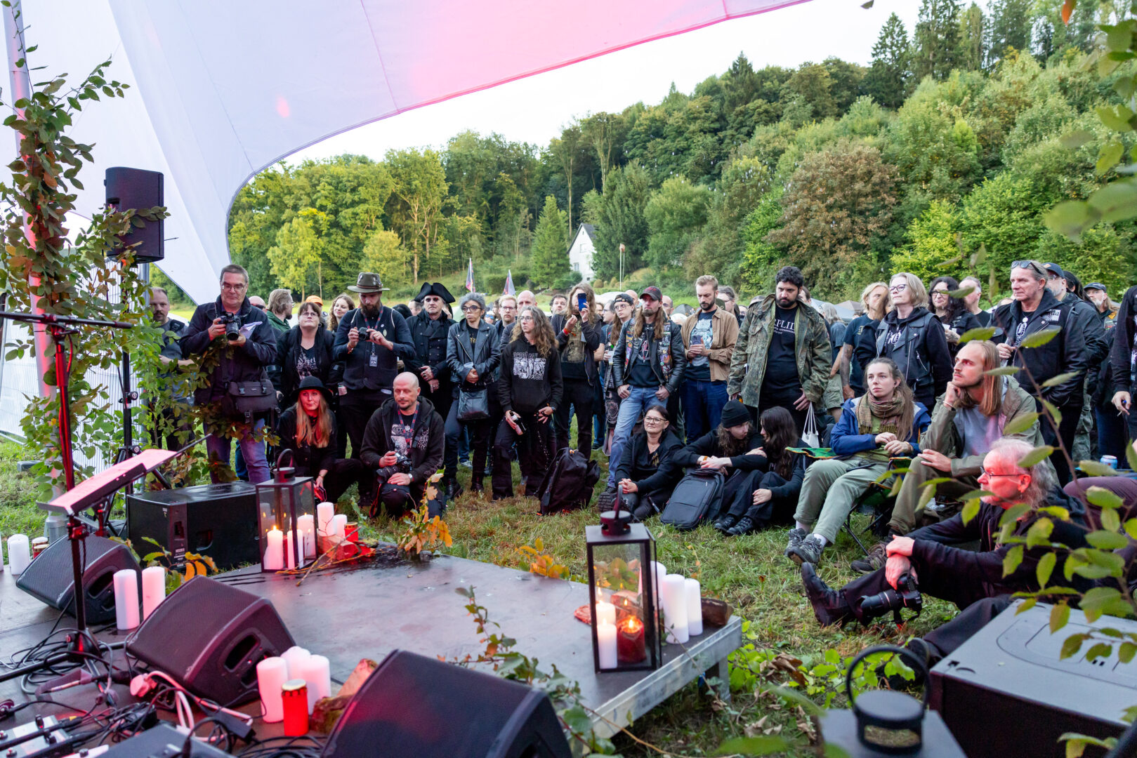 Pünktlich zum Empfang mit Begrüßungs-Bier fand ich mich am frühen Donnerstag-Nachmittag an der Höhle ein, wo ich gleich vom Label-Chef Martin Koller nebst Kollegen Gunnar Sauermann freundlich empfangen wurde. Für einen kleinen Austausch ist immer Zeit und wenige Minuten später startete mit idyllischem Blick auf der Anhöhe des Zeltplatzes das australische Dungeon Synth-Projekt Tír als erster Act seine Performance. Minimalistisch, sehr stimmungsvoll – aber weit weg von progressiv und herausfordernd – klingt das Projekt wie ein langes stimmungsvolles Intro und passte aus meiner Sicht als Einstimmung hervorragend in den Ablauf. Flashbacks an die gute alte Zeit Mitte der Neunziger (Mortiis is calling you) kamen somit von ganz allein. Ein sehr sympathischer und fokussierter Künstler, der mehr als nur Höflichkeitsapplaus erhielt und diesen auch dankbar zur Kenntnis nahm.