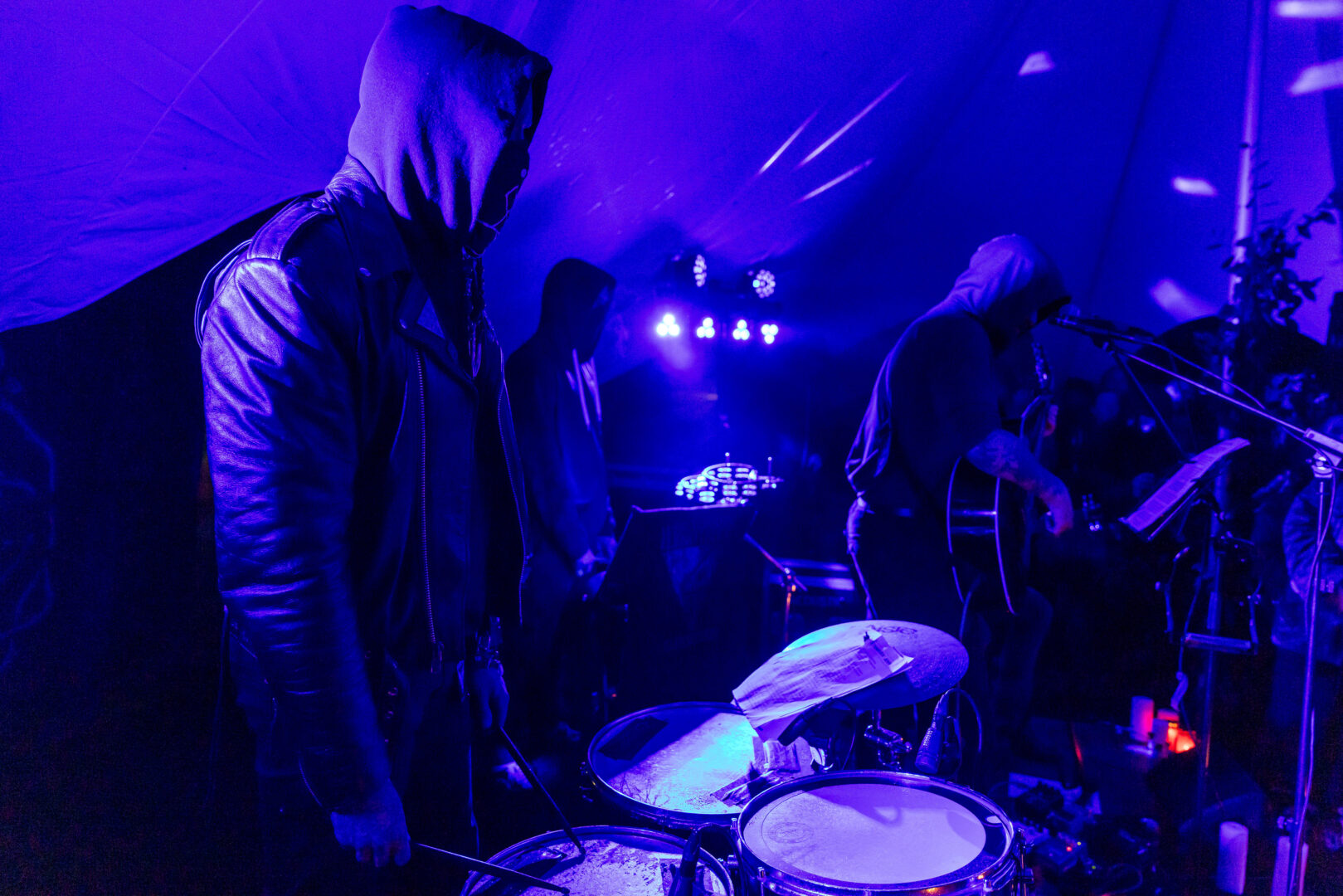 Das in 2020 erschienene Debüt der deutschen Vrimuot war ein feines Stück Neofolk mit eigenem Standbein und ich war schon sehr gespannt auf den Auftritt. Passende Bühnen-Accessoires, Kerzen uvm. stimmten im langsam schwindenden Licht des Tages die Besucher ein, nur sollte sich mit dem aufkommenden Starkregen der Beginn etwas verzögern. Die Band wollte ihr neues, im November erscheinendes Album "Lupus Viridis" in kompletter Länge aufführen. Mit Kapuze und verdeckten Gesichtern gab man sich nebst Schlagwerk einheitlich präsent und die neuen Stücke haben auf jeden Fall gehörige Strahlkraft. Der Regen hatte mich dann trotz Schirm komplett durchnässt, sodass ich den akustischen Set der Weißrussen Dymna Lotva ausfallen ließ. Ein schöner Auftakt war trotzdem gemacht.