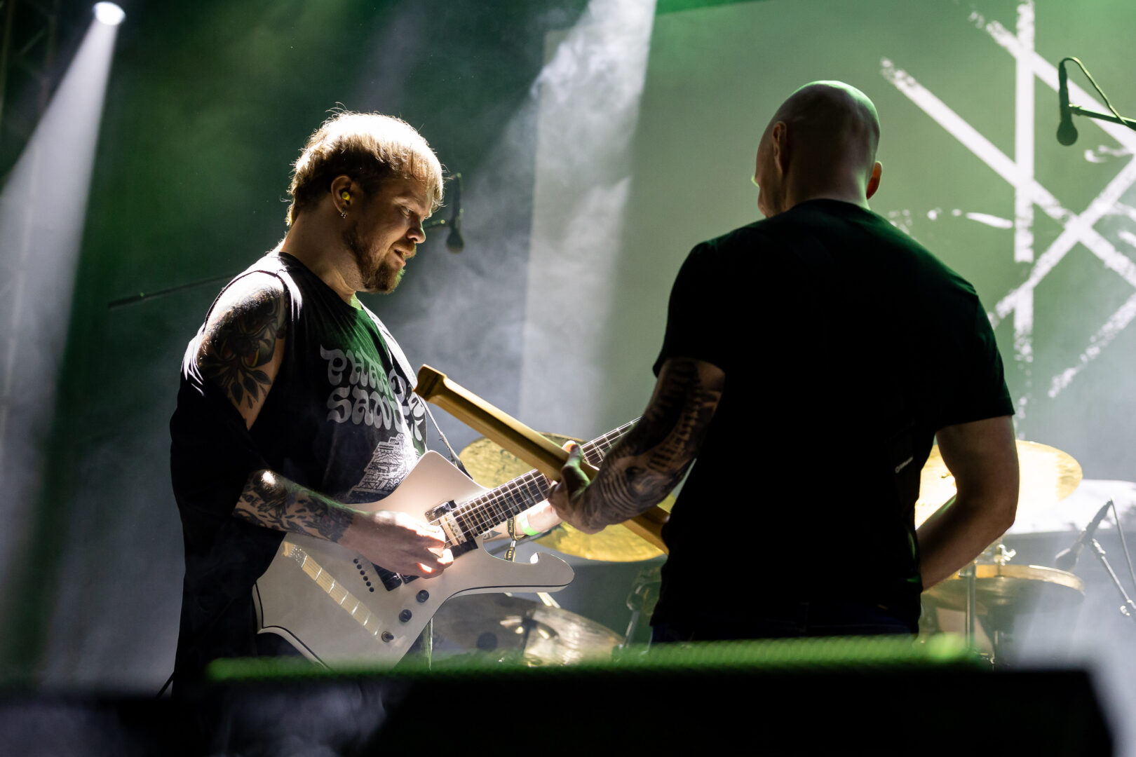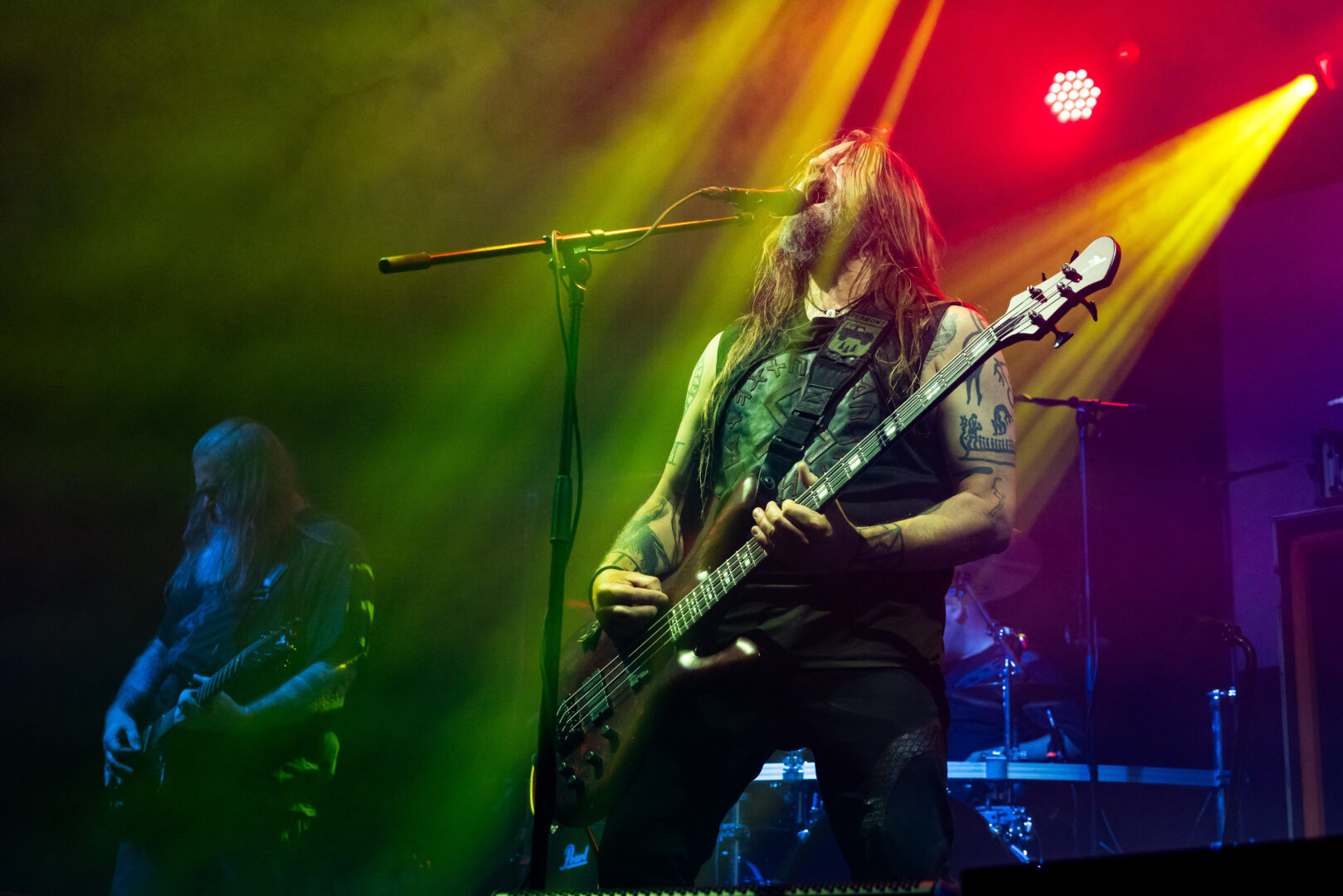 Enslaved , den norwegischen Berserkern. Exklusiv fürs Prophecy Fest 2025 führt man die "Hordanes Land" auf und diese Platte gehört definitiv zu den archaischen, wilderen Releases der Norweger. Vom ersten Moment an wird die Bühne im Sturm genommen, ordentlich Nebel und ruppiger Sound bestimmen die Szenerie. Das Publikum kriegt zu später Stunde nochmal den nötigen Schuss Energie verpasst. Zwischen Raserei und getragenen Abschnitten bleibt man innerhalb der Platte meist im urwüchsigen Black Metal verhaftet - die späteren progressiven Enslaved bleiben bis auf den späteren Zugabe-Song eher außen vor. Für die vielen Kuttenträger, unter denen nicht wenige Black Metal-Enthusiasten sind, ist dies natürlich ein besonderes Happening. Also zu später Stunde wird hier noch so richtig Staub aufgewirbelt und einen Klassiker des nordischen Metal so am Bühnenrand im Stage-Acting zu erleben, das hat Schmackes.