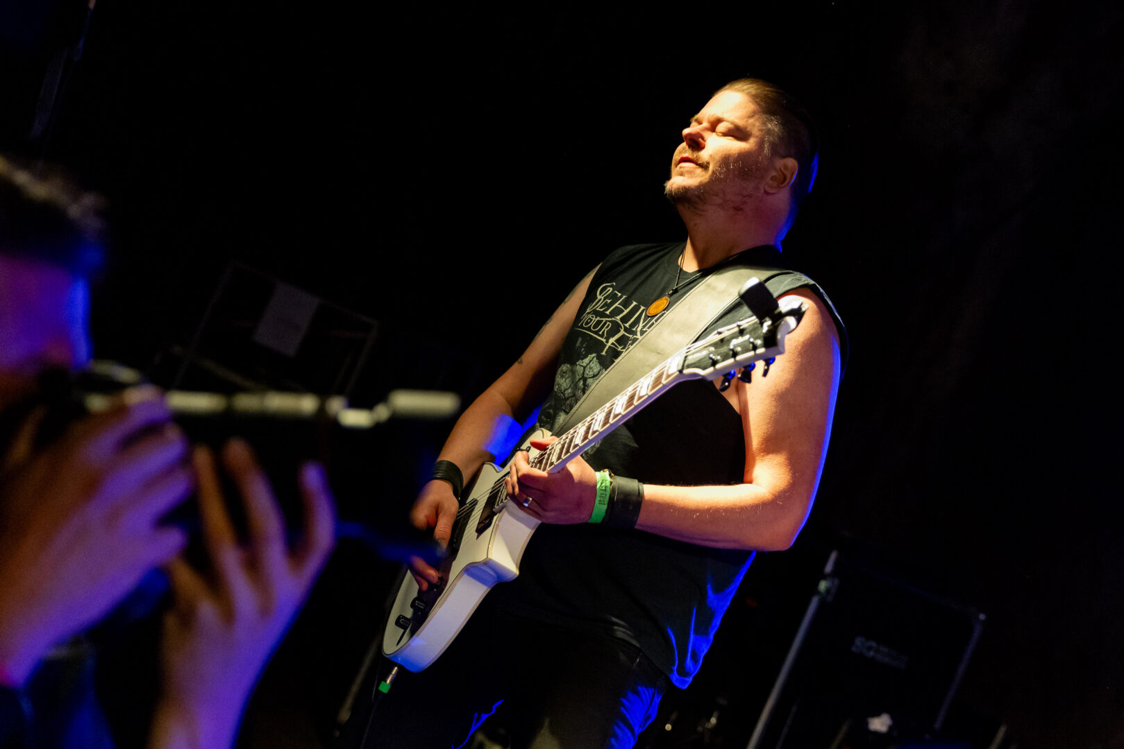 Mit dem sehr beliebten bayerischen Black Metal von Gráb ging es weiter – musikalisch unterstützt von Markus Stock, Allen B. Konstanz und Dan Capp von Wolcensmen. Somit war der handwerkliche Teil safe, das blaue Licht ohne Gesichts-Erkennung über die komplette Länge des Gigs kam der Atmosphäre der Songs mehr als entgegen (um einiges vorteilhafter als seinerzeit noch auf dem lichteren Nachmittag in 2023). Die beiden Alben der Band sind moderne Black Metal Highlights und der hoch gewachsene, archaisch wirkende Fronter Grànt hatte von Anfang an die Crowd in der Hand. Gesanglich zwischen Knurren und Keifen, wissen die charmanten Songs zwischen melodisch schleppend und hymnischem Mid Tempo an die guten alten Zeiten von Lunar Aurora zu erinnern, nur irgendwie melodischer. Dank des Lichts und der absolut runden Song-Auswahl ein auf den Punkt gespielter Gig – Headbanging und zufriedene Gesichter, wohin man auch schaute.