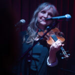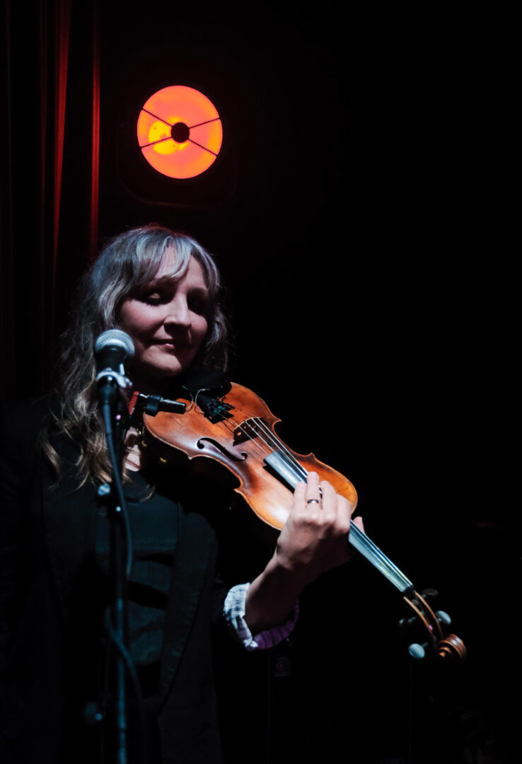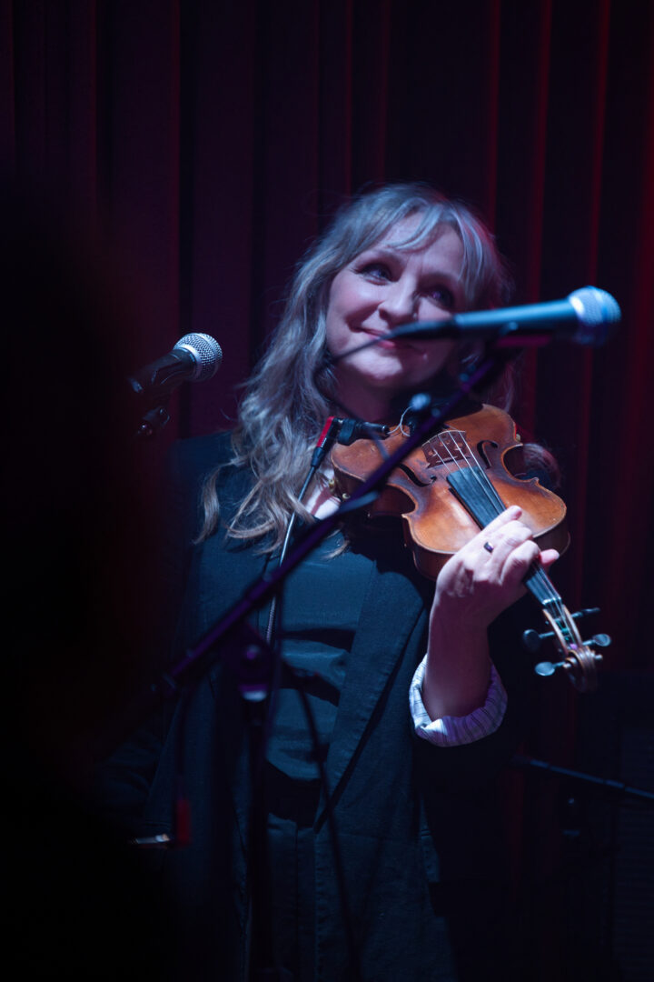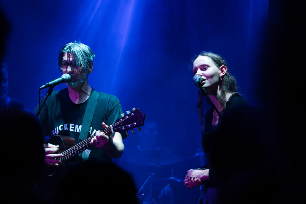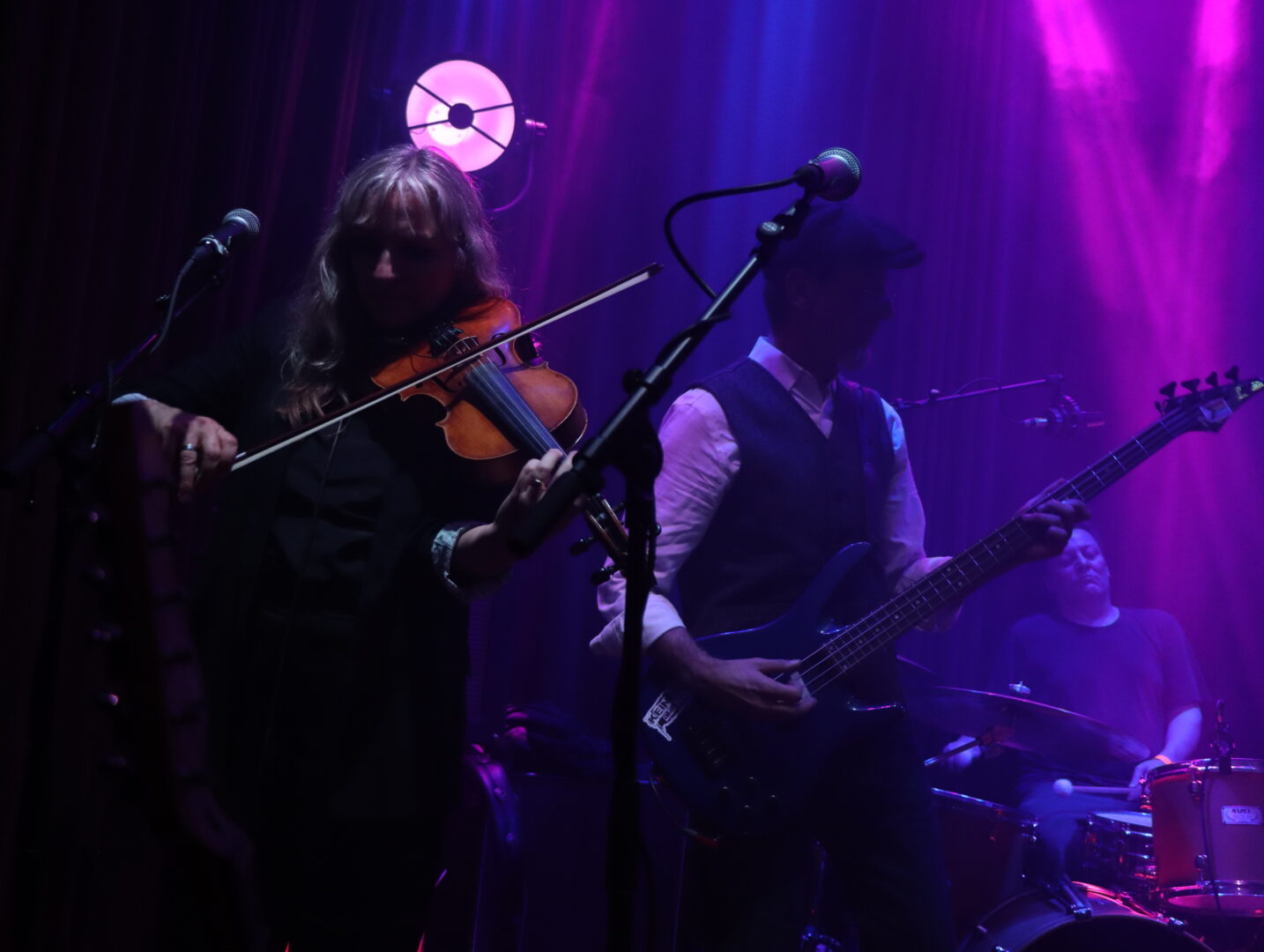 Dies war marginal oder eine subjektive Wahrnehmung – viel schöner war es aus der Nähe zu beobachten, mit wieviel Hingabe und Aufmerksamkeit mit dem Publikum, aber auch untereinander mit den Musikern agiert wurde. Die Besetzung wurde permanent alle paar Songs gewechselt – alte und neue Gassenhauer im steten Wechsel – sodass mit wahnsinnig viel Sympathie und Rücksichtnahme unter den Musikern auf diesem schmalen Raum performt wurde. Mit Anne de Wolff (u.a. Calexico, Rosenstolz) an der Violine war man musikalisch immer irgendwie nah am folkigen Rock – handwerkliche Leidenschaft ergänzte sich hier um ein Vielfaches zum eh sehr intensiven Spiel von David.