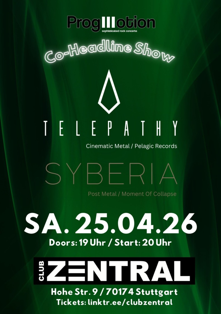Aufgrund einer Kooperation mit dem Club Zentral in Stuttgart winken den beiden glücklichen Gewinnern bei unserem aktuellen kleinen ProgQuiz je zwei Gästelistenplätze bei der ProgMotion Double Headliner Show von Telepathy und Syberia am Samstag, dem 25.04.2026!